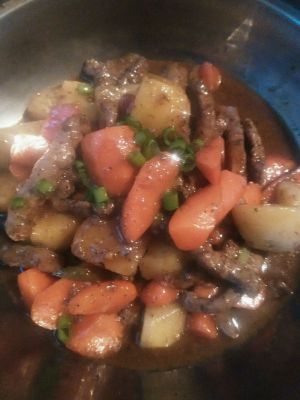 牛肉用黑胡椒粉呛半小时,大火爆炒至色变白,盛出备用。 土豆胡萝卜块爆炒一两分钟,加蚝油,老抽酱油,加牛肉炒均匀,加水,切好的蒜白段,大火焖五分钟。