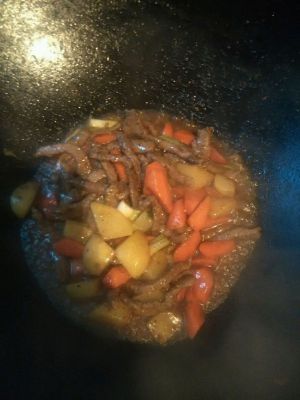 待土豆和胡萝卜颜色变深,加入牛肉翻炒,并加些许冷水,开始小火炖制十几二十分钟,最后出锅