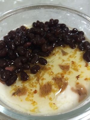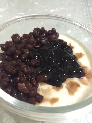 转中火蒸15分钟,放个汤匙在双皮奶上不会陷进去即可,加入红豆,美味香滑的双皮奶制作成功。