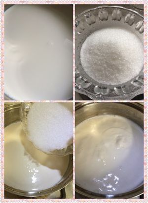 等奶热后把白凉粉倒下去,一边倒一边搅拌奶锅不然会糊锅等全倒完后在搅拌一会之后关火