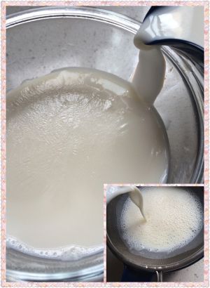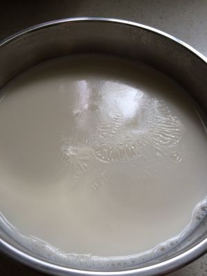 牛奶和蛋清打在一起搅拌均匀后,过筛两到三遍,然后缓缓的将蛋奶液顺着有奶皮的碗边,慢慢的倒入,可以看到奶皮会自己浮起来。
