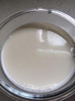 鸡蛋清、黄分离,将蛋清打几下,打散就行,加入没有奶皮的牛奶里搅拌。