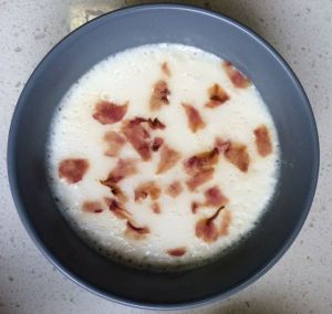 倒出大部分牛奶,碗底留点底不要倒净,不然奶皮容易粘在碗上,待会儿就浮不起来了