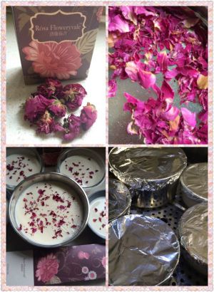 取洛施玫瑰花,只用花瓣部分,撒在奶皮表面,然后用锡纸把碗口包住,蒸锅水烧开后,将牛奶放入,中火20分钟后关火,等5分钟后在取出。