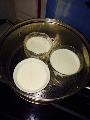 来个最终成品吧,用的家里的小花花做的样子,如果大家喜欢红豆,芒果口味,可以自己添加。我吃原味的。(刚蒸完上面还有点奶状的,需要凝结,不要着急。凉上一个多小时就好啦,如果喜欢吃凉的,可以放到冰箱,第二天吃起来也很棒,凉凉的,甜丝丝,我这个不爱甜食的人都喜欢的不得了,是不是因为自己做的原因呢