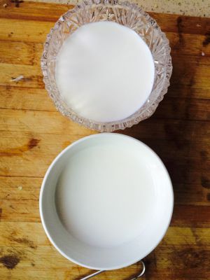 等结了奶皮后(需要15~20分钟,比较等不及的可以放到凉水里凉,这样加快时间)在奶皮边用细牙签隔开,倒入另一个碗中(一定要把奶皮留在原碗里,留个碗底就OK)