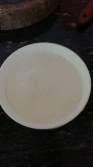 上图的大碗牛奶,用筛子过滤掉不化解的糖分(为了口感更加细腻光滑)后,再反倒入原小碗里。(依然顺着碗沿倒入,⚠牛奶要倒去刚才的奶皮下面)
