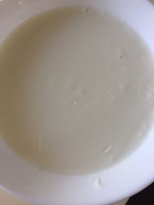 把牛奶倒入蛋清里,轻轻拌,把那一层膜浮起来。到上面一层膜也有了。