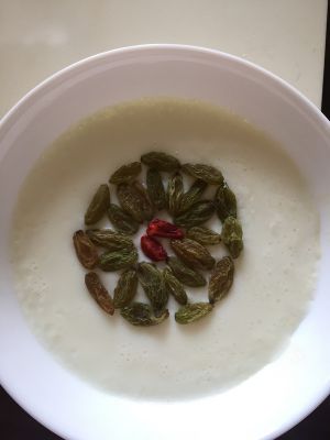 开水烧开后入锅(加盖)蒸10分钟,关火闷5分钟后取出,牛奶已凝固,表面放上葡萄干和枸杞子,凉后入冰箱。