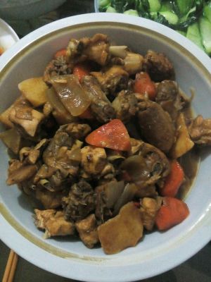 4、炒锅重新热油,爆小米辣,花椒,洋葱,等出香味时加入土豆胡萝卜翻炒至土豆胡萝卜表面脱水(也就是看上去皱巴巴的)时,加入鸡块,加老抽,生抽,盐,糖调味,加水半碗焖至土豆胡萝卜软烂就可以出锅了。