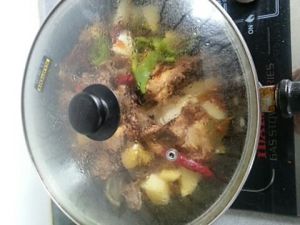 开锅后,放土豆,葱!盖上锅盖!等土豆焖半熟!