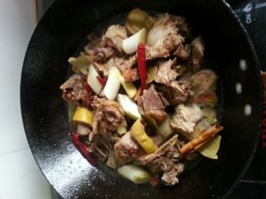 3、锅内加油少许,爆香姜片后加鸡块炒至焦香出油后加料酒焖半分钟,加温水一碗(吃饭的小碗)大火煮15分钟左右,盛出。