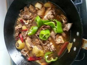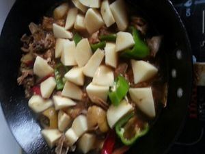 将土豆炖至软但不烂,绵沙。出锅前放入青椒,翻炒,让青椒味融入汤汁里,翻炒后,锅里有少许汤汁即可出锅。