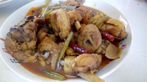 炒出焦黄色倒入鸡块,干椒段、姜片、葱花煸炒