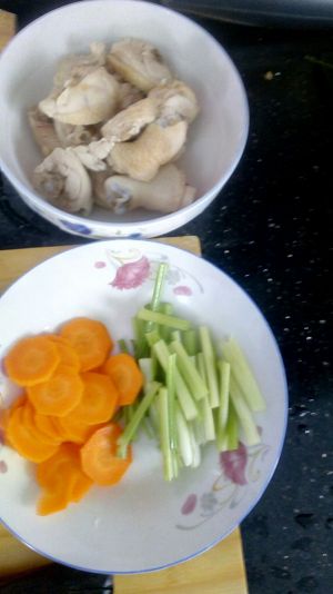 胡萝卜切片,芹菜切段,鸡腿冲洗干净