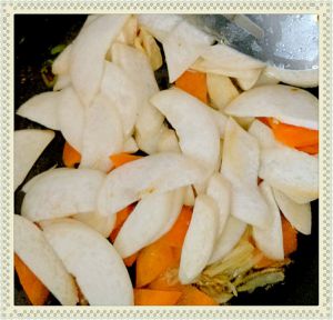 再起油锅(油稍多些,杏鲍菇吸油),油热后炒香葱姜,下入胡萝卜片,炒匀,再下入杏鲍菇,再立刻加少许水煮一分钟左右