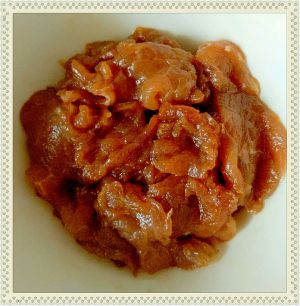 肉切片,加入生抽、老抽、胡椒粉、湿淀粉,少许油(炒时不粘连),拌匀后腌制十分钟