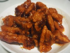 锅内加少许油、番茄酱、白糖,小火炒成糊状,把炸好的里脊倒入锅内掂几下,让所有炸肉都沾上酱汁即可。