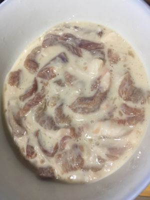 起锅热油时,我们把腌好的肉放入蛋糊中。