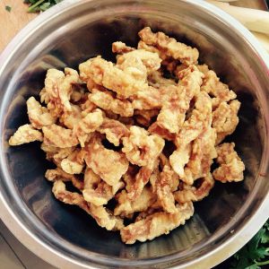 油温五成热下锅炸鸡肉块。