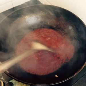 放酱快速翻炒!放二勺糖、二勺白醋(吃饭用的勺)适量的水!为了颜色好看亮些在倒入一勺热油!在勾芡淋上即可
