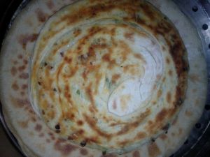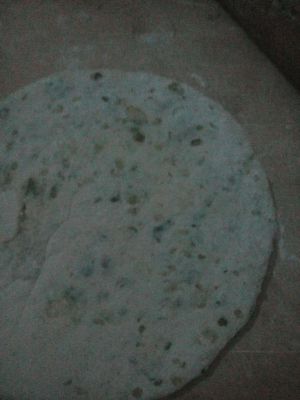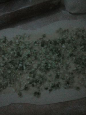面团压成饼,均匀铺满调好的油,撒好葱花