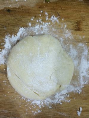 把压扁之后的饼用擀面杖擀成适宜的厚度。