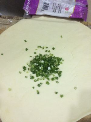 把面擀成面皮,撒上葱花,油,加点盐,五香粉。抹匀。