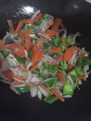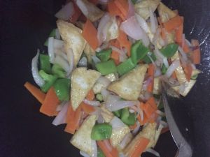 加入蒜末,姜丝,爆香后加入素三丁翻炒。