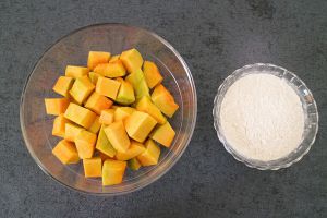 准备好食材,南瓜切小块放入锅中蒸熟。