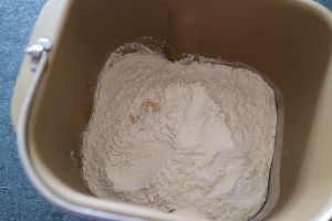 把南瓜泥放入面包机,加入面粉,玉米油,启动揉面程序。