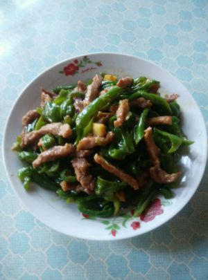 放入拍好的蒜泥,爆香,放入青椒,炒至变色后,放入肉丝一起煎炒几秒后,放水