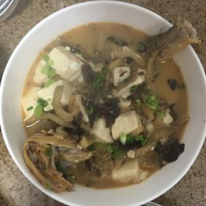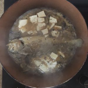 加入榨菜丝、豆腐,继续煮炖至鱼全熟(我刚好还有两朵泡发的黑木耳,顺便切细一同放入汤里)