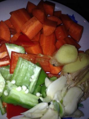 胡萝卜 红绿辣椒 姜 蒜切块待用