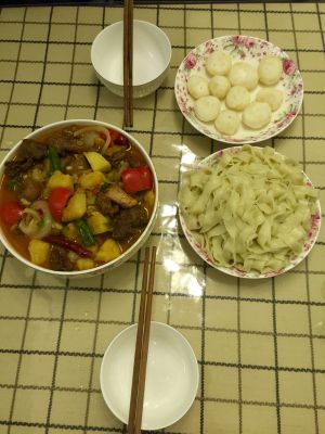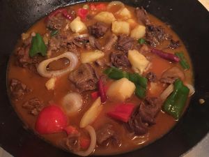 先烧油 将待用的姜 蒜 和料包里的大料爆炒。然后放入鸡块。爆炒2分钟,在加入酱包然后放入土豆 胡萝卜 翻炒5分钟,加水莫过菜,等土豆沙了放入手擀粉和红绿辣椒,(配色)再煮片刻,收汤。。。味道棒极了。。嘻嘻
