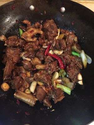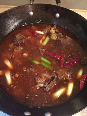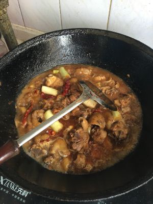 锅烧热放油,加入糖,酱油上糖色,然后放入各种辣椒,葱,花椒,加水淹没鸡块,煮20分钟