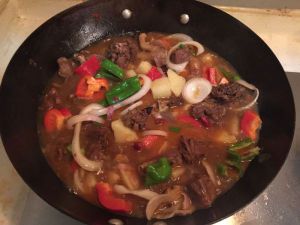 五分钟后放入洋葱 青椒 红椒~再烧五分钟左右就能出国了