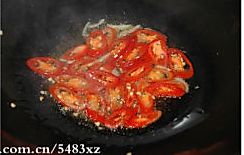 热锅上油,油热后下姜丝爆锅,倒入红椒炒香。