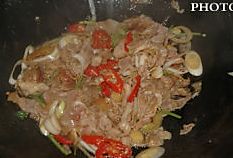 倒入肥羊卷,烹入料酒翻炒。