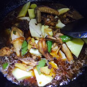 炒出香味后放如鸡肉炒!炒至鸡肉变色!加入少许酱油、调色!稍微炒2到3分钟加入热水!(注意千万不能加冷水!)之后盖盖子顿10分钟左右!加入黑木耳个鸡腿菇!在炖30分钟!