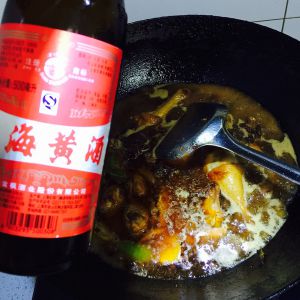 后放入黄酒,我放了大半瓶,一是去腥二是入味,可加水也可不加水。再倒点酱油蚝油后大火烧开。