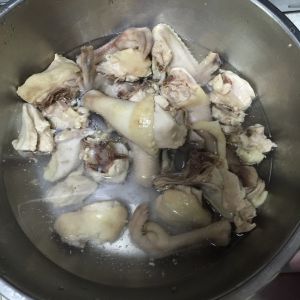 鸡去内脏、洗干净、控水、切成小块、烧开水,把鸡肉块焯水、控水备用
