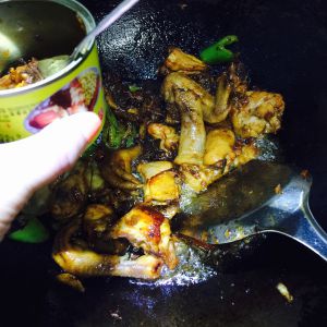 冰糖完全融化后,倒入鸡块(尽量切小块)翻炒上色,翻炒3分钟左右盛出备用