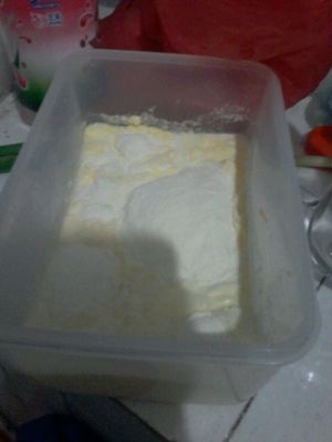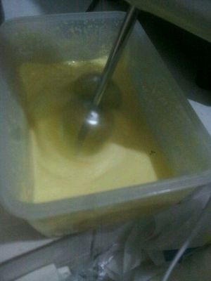 牛奶300g 芒果冰淇淋粉100g放在器皿中用搅拌器搅动20分钟以上