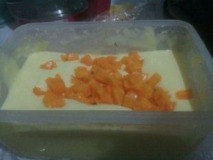 最后一次搅动后放入芒果肉再次放入冰箱冷藏6到10个小时以上