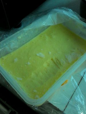 将蛋黄泥与芒果泥与打发的淡奶油混合在一起,打顺。(不要打太久,打到看到顺就可以)放冰箱冰4小时左右。实际上要看装雪糕的溶器大小,反正看到结了就可以了。