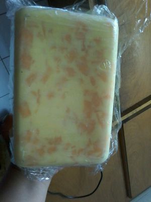 然后将芒果打成糊状(可以用机器打,但是我不建议,可以将保鲜膜裹在蒜锤上面锤,这样水分不会流失吃的时候还会吃到果肉,满满的惊喜哦)