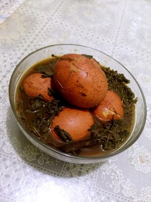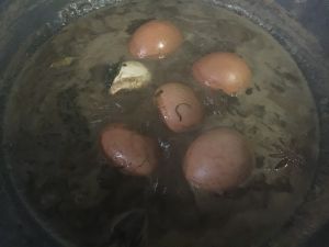 捞起鸡蛋,敲粹,不剥壳。再换一锅水,水里加入用料。(十三香,香叶、八角)倒入:盐巴,老抽,糖…煮开后,加入一把茶叶!