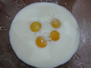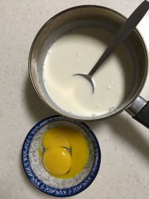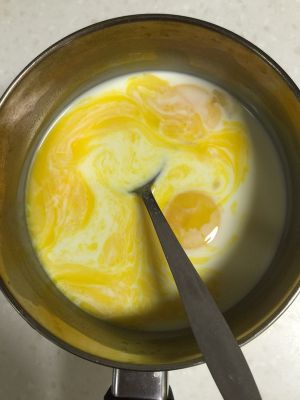 将蛋黄加入放凉的牛奶液中。