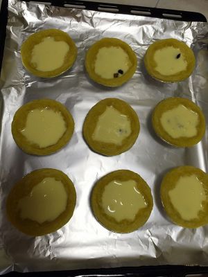 取出后倒入蛋挞液,可以在蛋挞皮底部加入蔓越梅,提子干增加口感。入烤箱220度烤15分钟~